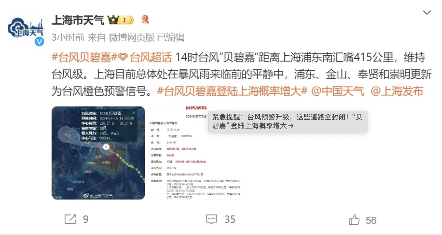 9月15日凌晨,上海市公安局、市交通委员会联合发布台风预警道路交通管控措施通告:根据气象部门预测,今年第13号台风“贝碧嘉”将于9月15日下午起给上海市带来强风暴雨天气。为确保道路交通安全,上海市公安、交通管理部门届时根据台风对道路交通影响,视情采取以下道路交通管控措施